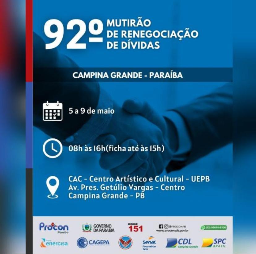 O Procon Estadual realiza, a partir desta segunda-feira (5) até a sexta-feira (9), o 92º Mutirão de Renegociação de Dívidas, oferecendo aos consumidores campinenses a oportunidade de regularizar seus débitos com condições facilitadas. A ação será realizada no Centro Artístico e Cultural da UEPB (CAC), localizado na Avenida Presidente Getúlio Vargas, no Centro de Campina Grande, das 8h às 16h. A distribuição de fichas será realizada até as 15h.