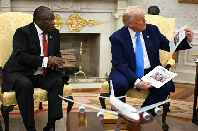 O presidente dos Estados Unidos, Donald Trump, confrontou o presidente da África do Sul, Cyril Ramaphosa, nesta quarta-feira (21/5), e causou mais um momento de embate e constrangimento no Salão Oval da na Casa Branca. O republicano exibiu um vídeo que, segundo ele, comprovaria a existência de um “genocídio branco” no país africano — o que é classificado como falso pelo governo sul-africano.
